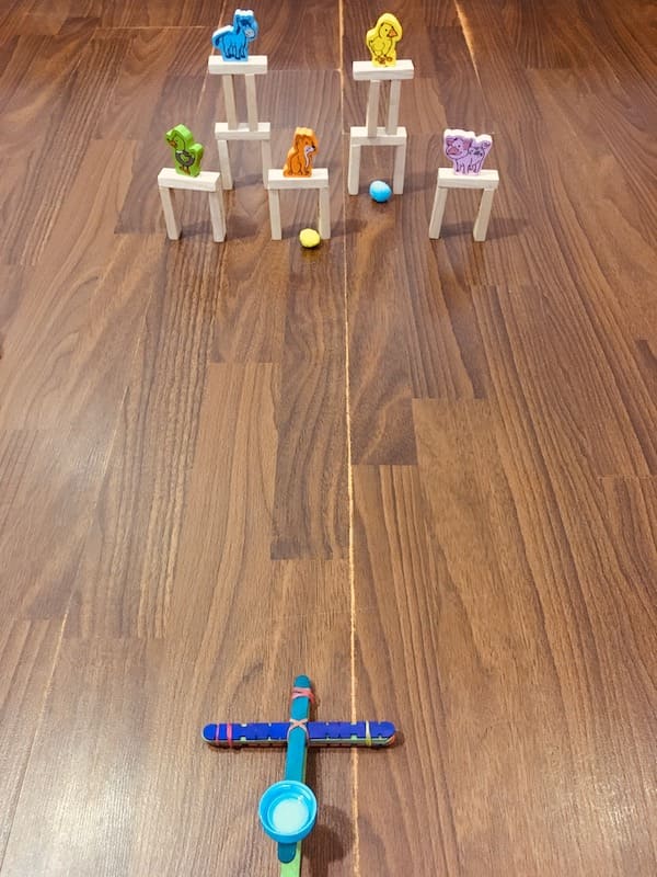 Your targets are set! Now, take turns in knocking off the figurines from the jenga towers with your popsicle stick catapult and score points.