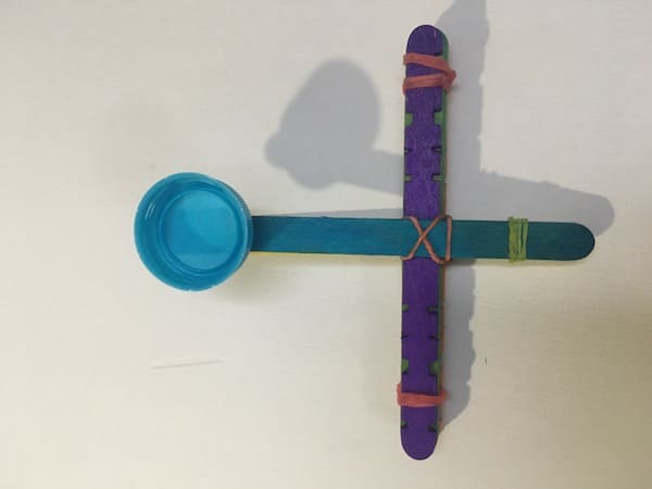 Place the ping-pong ball in the cap and pull down the launcher popsicle stick with your finger and release. Your popsicle stick catapult is ready to launch!